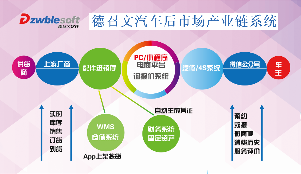 其中德召文【汽配供應鏈系統】包括【汽配軟件】+【WMS倉儲系統】+【供應鏈電商平臺】+【財務軟件】+【固定資產】一體化解決方案